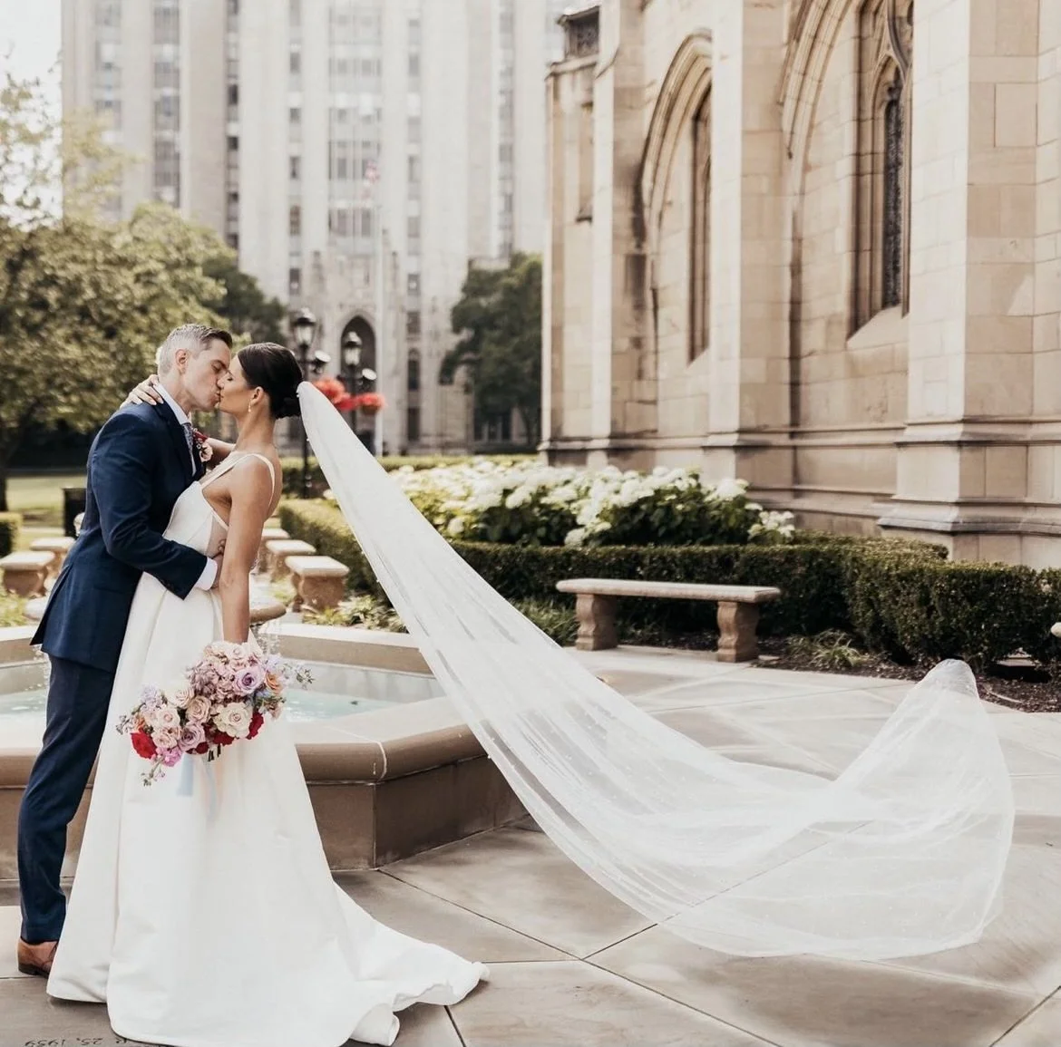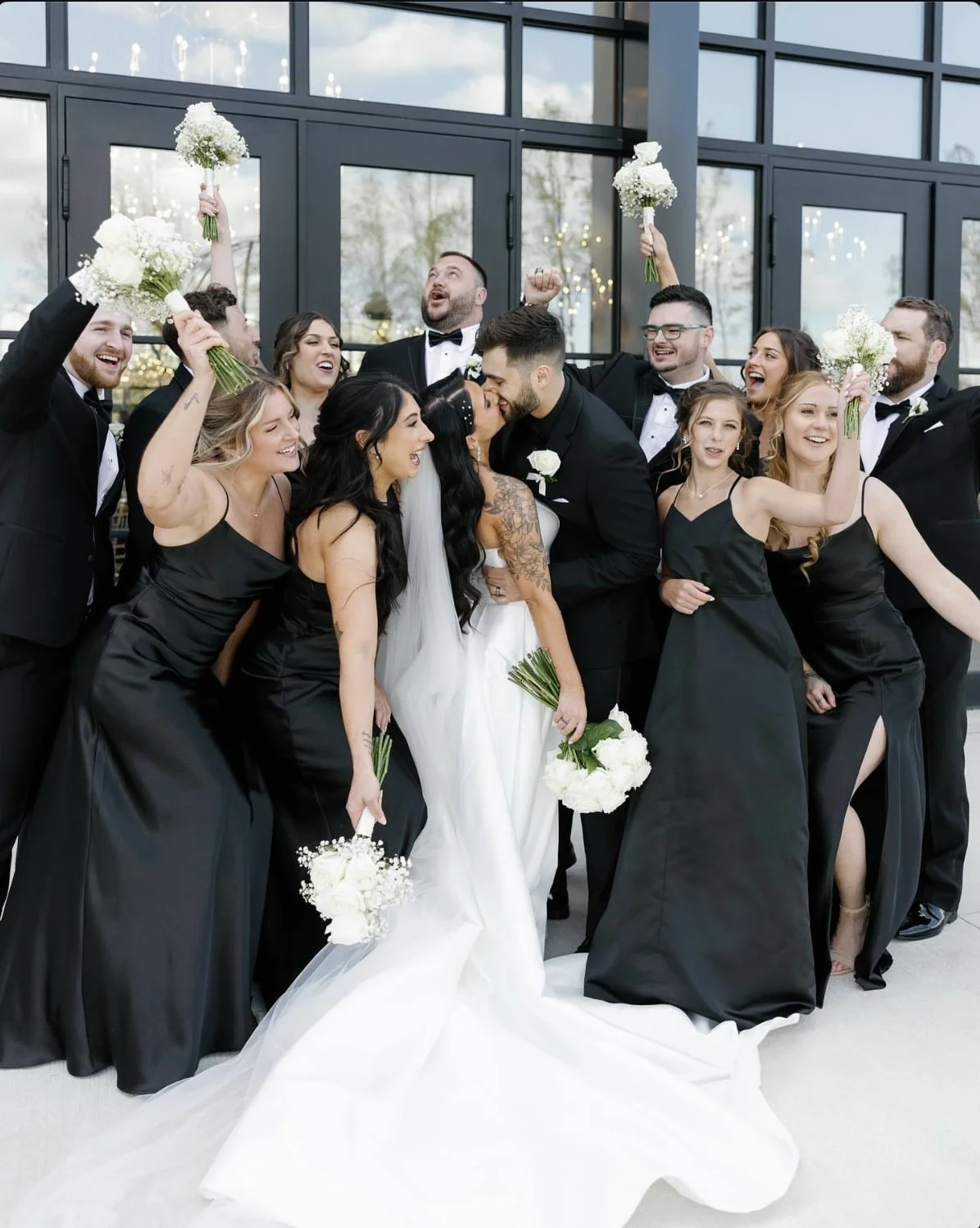 A group of people dressed in formal wedding attire celebrating outside a modern building with large glass windows. The bride and groom are at the center, kissing and surrounded by wedding party members holding bouquets.